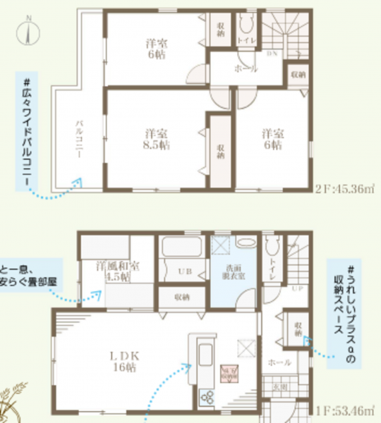 - システムキッチン、カウンターキッチン、シャンプードレッサー、洗浄便座、浴室乾燥機、モニタ付インターホン、駐車場2台分、床下収納、トイレ2箇所