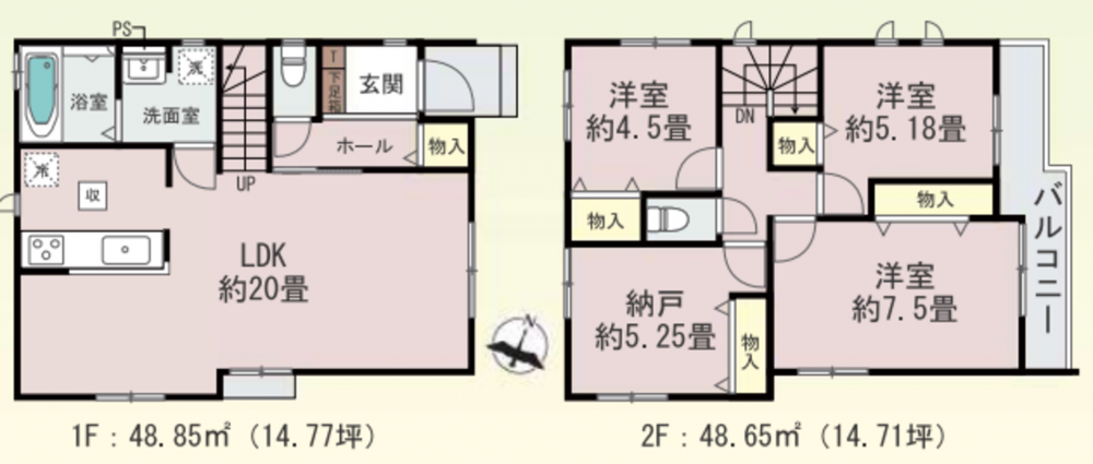- システムキッチン、モニタ付インターホン、複層ガラス、駐車場2台分、床下収納、トイレ2箇所