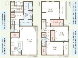 - システムキッチン、シャンプードレッサー、浴室乾燥機、追い焚き、ウォークインクローゼット、モニタ付インターホン、床下収納