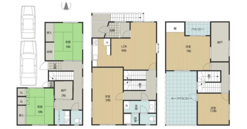 - システムキッチン、カウンターキッチン、食器洗浄乾燥機、IHクッキングヒーター、洗浄便座、追い焚き、モニタ付インターホン、駐車場2台分、トイレ2箇所
