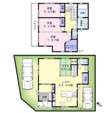 - 床暖房、システムキッチン、カウンターキッチン、食器洗浄乾燥機、シャンプードレッサー、浴室乾燥機、モニタ付インターホン、洗浄便座、ウォークインクローゼット、追い焚き、駐車場2台分、トイレ2箇所