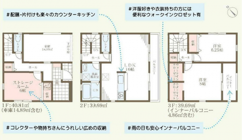 - システムキッチン、シャンプードレッサー、洗浄便座、浴室乾燥機、追い焚き、ウォークインクローゼット、モニタ付インターホン、床下収納、トイレ2箇所