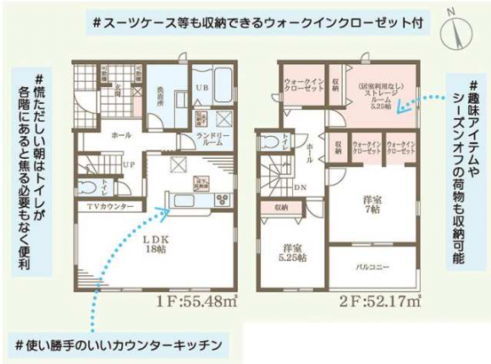 - システムキッチン、カウンターキッチン、シャンプードレッサー、浴室乾燥機、追い焚き、ウォークインクローゼット、モニタ付インターホン、駐車場2台分、床下収納、トイレ2箇所