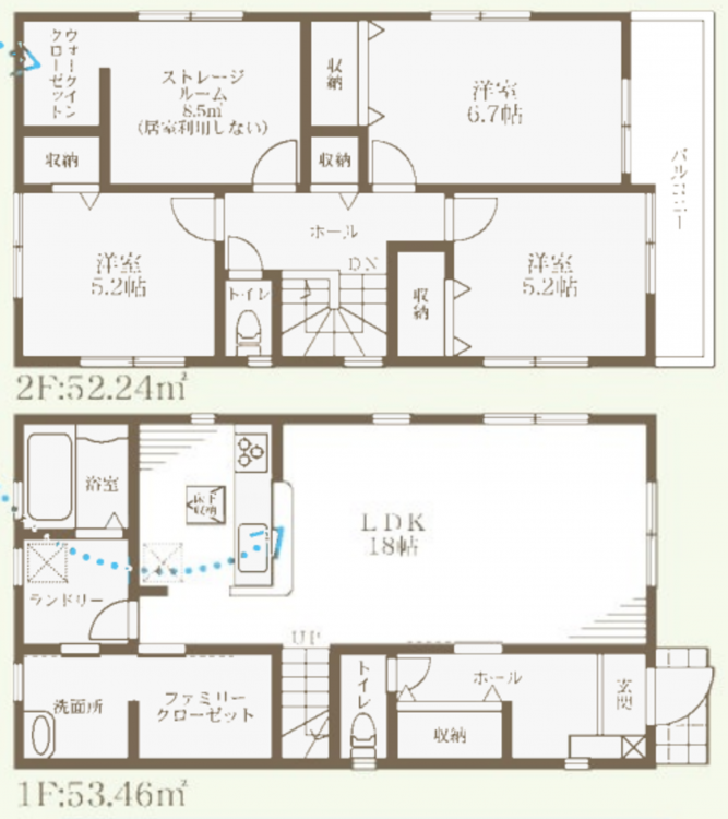 - カウンターキッチン、浴室乾燥機、モニタ付インターホン、ウォークインクローゼット、駐車場2台分、床下収納