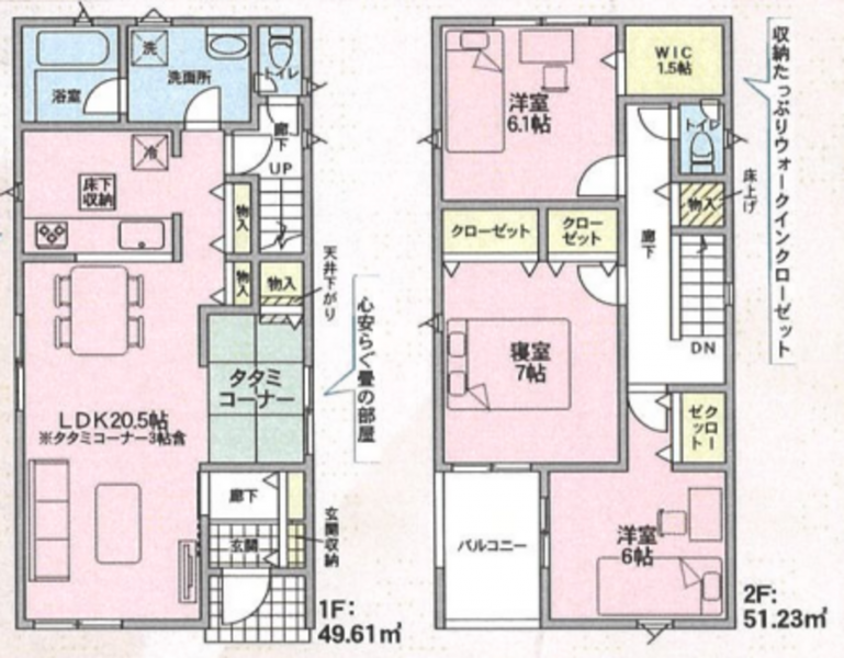 - システムキッチン、カウンターキッチン、シャンプードレッサー、洗浄便座、浴室乾燥機、複層ガラス、ルーフバルコニー、ウォークインクローゼット、モニタ付インターホン、駐車場2台分、床下収納、トイレ2箇所