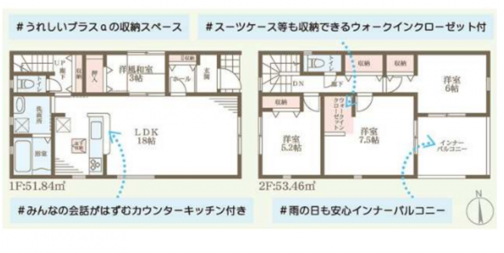 - システムキッチン、シャンプードレッサー、浴室乾燥機、追い焚き、ウォークインクローゼット、モニタ付インターホン、駐車場2台分、床下収納、トイレ2箇所